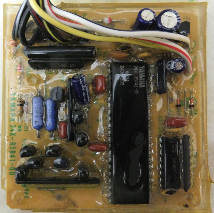 As evidenced elsewhere on this site, I'm a biker (the nasty, dangerous, antisocial suicidal maniac kind of bike - although the way some cyclists ride I'm sure that description could apply either way) and most of my mates are as well. Some of them have been riding since the days when all you had to do was stay on long enough for the examiner to sign the paperwork and you had a bike licence... and some of them learned their trade riding the noisy, smelly, liable-to-explode-at-any-second variety with two-stroke engines common in the 1970s and 80s. Of course with the onset of middle age and disposable income some of the guys hanker for the old days and search out the two-wheeled heroes of their impecunious youth. Thus it came to pass that a Yamaha RD500 appeared, largely in crates, and was subsequently restored and rebuilt by a die-hard Yamaha fan. Unfortunately, the beast refused to run correctly and the fault was traced to the non-operation of the exhaust 'powervalve'. Yamaha came up with the Yamaha PowerValve System and used it across their range of '2-smokes' from the early 80s. Like any other good idea, they tend to work for so long and then fail and they do so in a number of ways, one of which is for the electronics control unit to pack in. So as he was unable to find a replacement at a price worth paying, and as I learned my trade on the electronics of the 1980s, he waved it under my nose and threatened me with beer if I got it working. Cutting a story short, I did, of course, and as a result I have full schematics of the thing and am pretty confident that I could diagnose, if not actually repair other faulty ones as well. I throw in that last caution because this was the 1980s of course, and microprocessors were starting to appear everywhere and take over the world. Although the chip that Yamaha used is still available, it does have proprietary code programmed into it so if the chip itself proves to be duff, one would not only need to find a supplier of the chip but also a copy of the code and the necessary EPROM programmer to poke the magic in. However, it's extremely likely that the majority of faulty units are defective in ways that wouldn't affect the microprocessor so if you have a suspect unit, feel free to contact me and I'll tell you where to send it :D - and of course I have a mate with a known good one to use as a reference. You may well decide that an aftermarket combined CDI/powervalve controller is a better way forward and probably on a race bike or one where you just have to squeeze every last drop of grunt out of it, instead of doing the sensible thing and buying a more powerful bike, you may well be right. But rather like the DeLorean and it's 40 year old radio, anyone wanting an RD350, RD500 or even one of the smaller-engined liquid-cooled Yamahas in near-original condition would probably prefer it to have the proper electronics. It's dinosaurs like me that keep the prehistoric alive :D