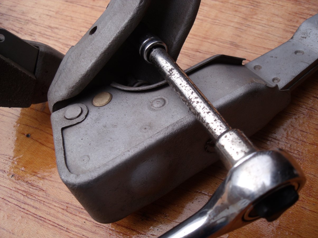 First thing to do, then, was to extract the calipers. Unlike most modern cars where the hydraulic rear caliper doubles as the handbrake, this Girling design is a two-part system. The main, hydraulic caliper responds to the footbrake pedal as usual, but the handbrake function is provided by a separate pair of cable-operated calipers mounted on top of the hydraulic units. The whole device is so bulky it looked unlikely that either side would simply drop out through the chassis tubes so I opted to remove the handbrake calipers first. Simple enough: disconnect the cable, bend back the locking tabs, extract 4 pivot bolts and... needless to say it wasn't that simple as the pivots were largely gripped by corrosion in the castings. With the units finally removed, I snipped the lockwires on the main caliper bolts and set to work with a 5/8" spanner. The lower bolts are, relatively speaking, easy to get at, but the top ones are out of sight and obstructed by hydraulic pipes, chassis tubes etc. and take some dexterity to extract. You can't actually remove them as the differential casting is in the way; you undo them fully and then, once you've disconnected the hydraulic lines (or, as I had to, clipped them with cutters as the unions were seized-in) "simply" pop the calipers off and out through the chassis rails (read: wriggle and squirm until free!). I found the easiest access for both was to the left of the car.