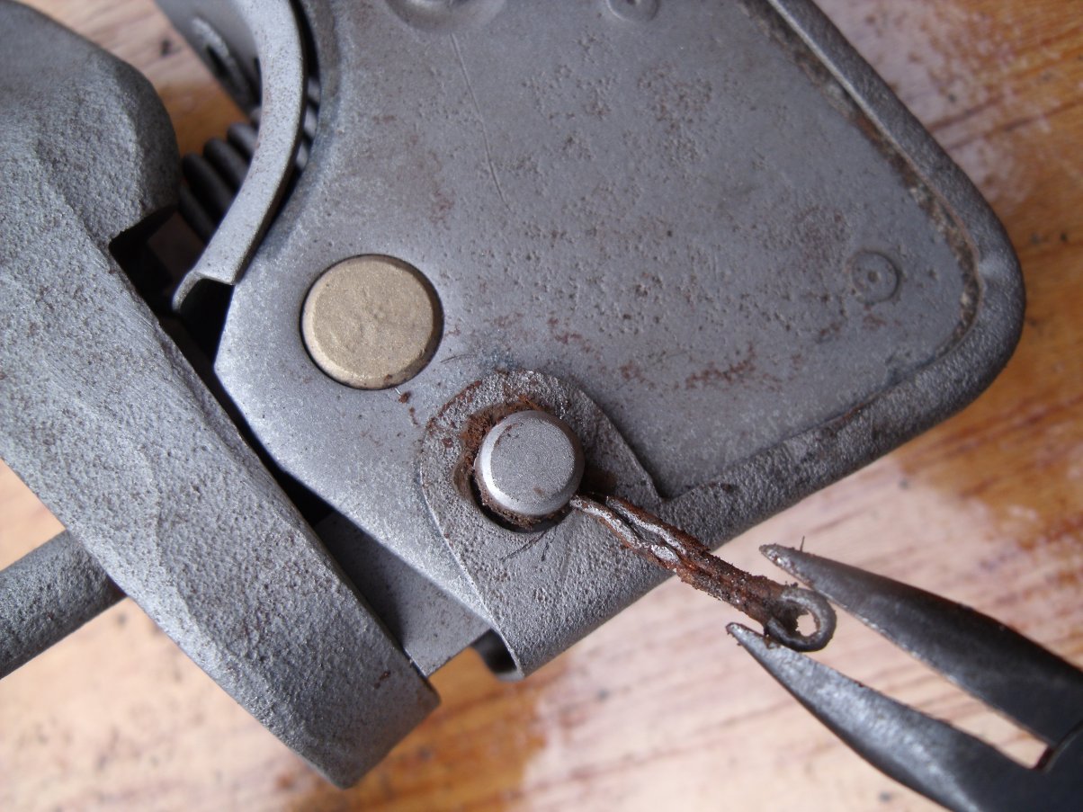 To strip further, begin by removing the small split pin that secures the pivot pin: