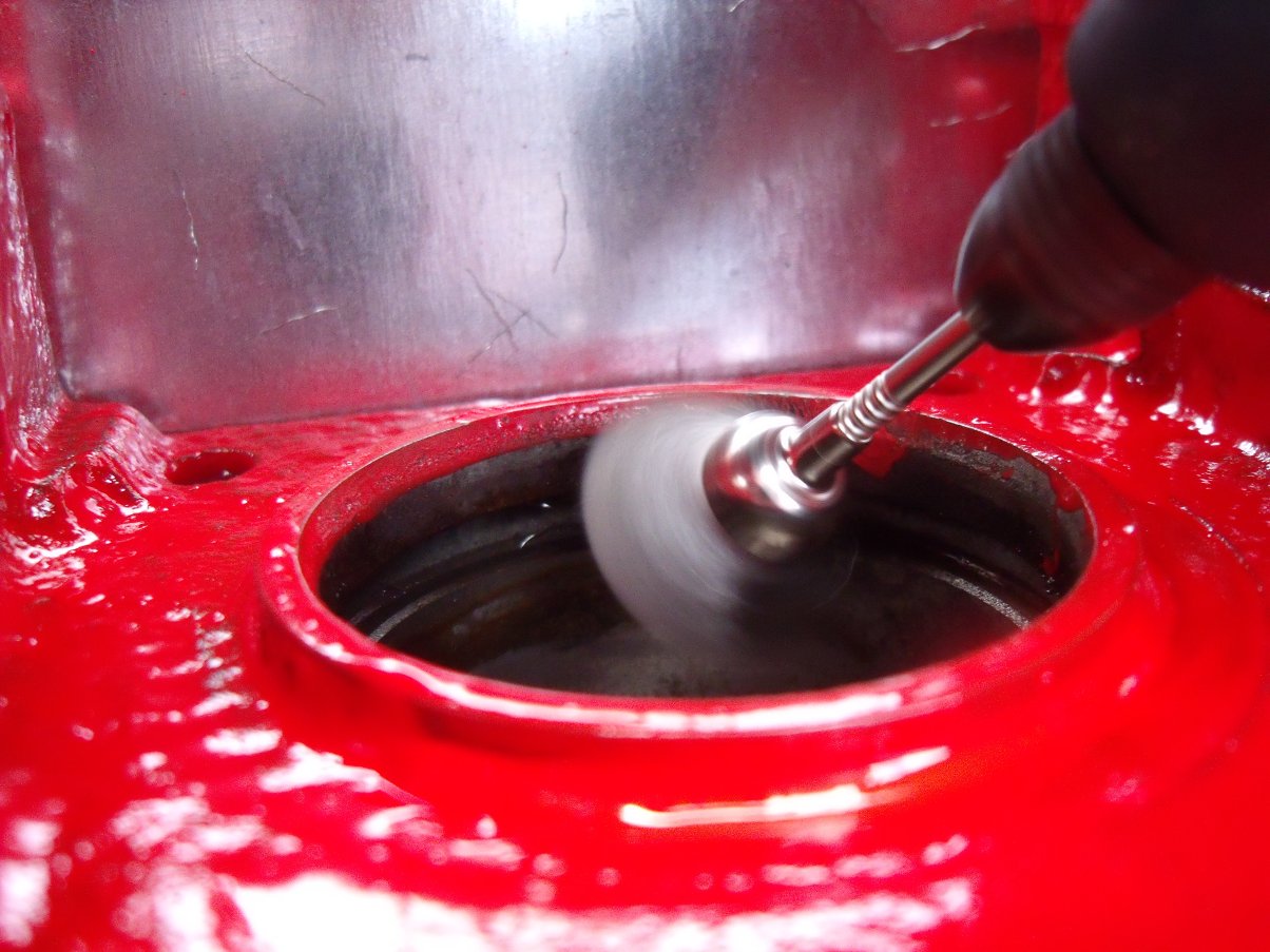 Before reassembly I used a tiny wire brush to clean off excess paint and some rust from around the cylinder bores...
